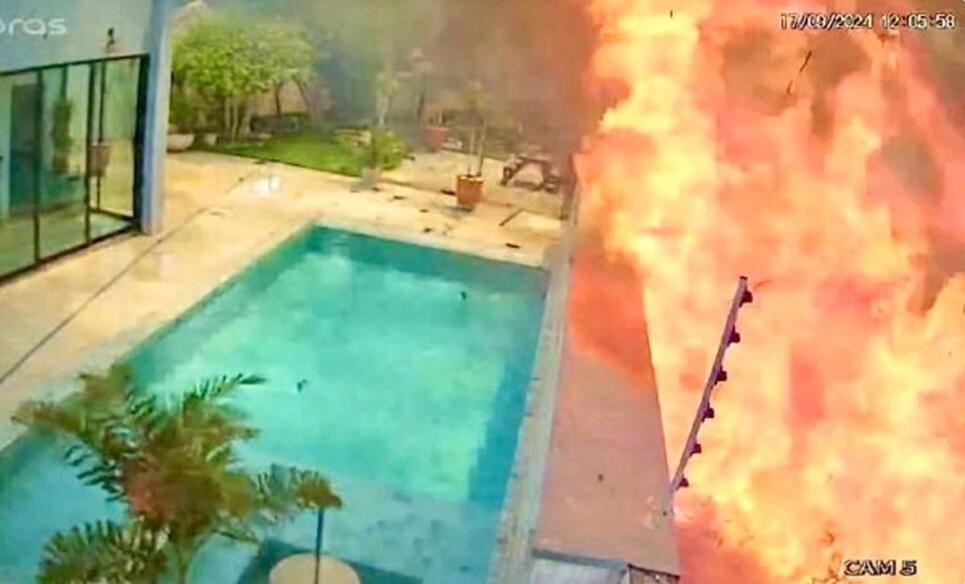 As proporções das chamas foram registradas pelas câmeras de segurança de uma residência, onde foi possível ver o momento que o incêndio se espalha pelo terreno ao lado e rapidamente se aproxima das casas.