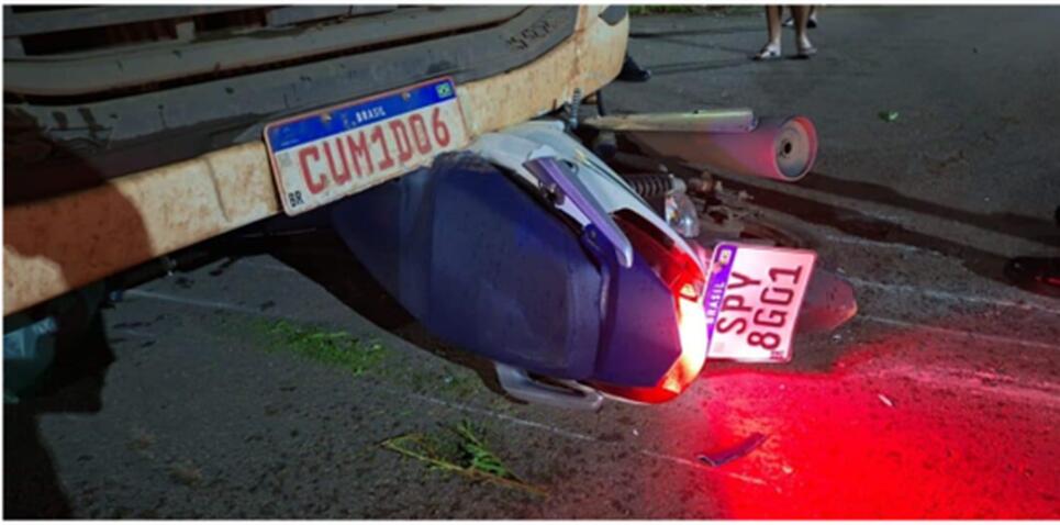 Motocicleta fica prensada sob carreta após colisão em cruzamento em Sinop; um ferido