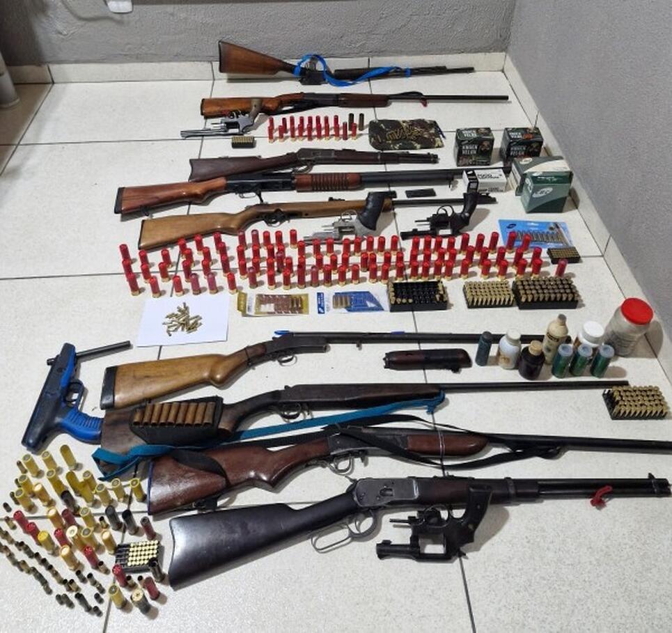 No local, as equipes localizaram e apreenderam um verdadeiro arsenal, composto por armas longas, armas curtas, inclusive de calibre restritos e centenas de munições de diversos calibres, além de outros objetos de interesse investigativo.