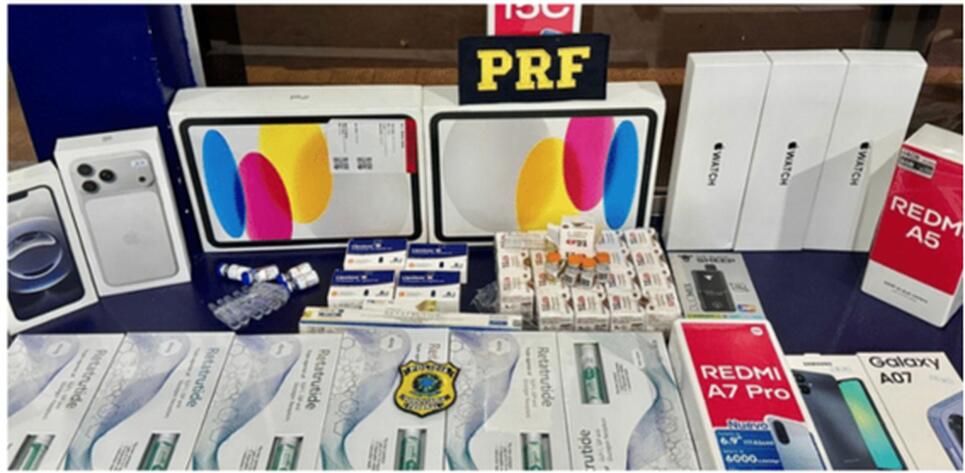 A Polícia Rodoviária Federal realizou a apreensão de diversos produtos eletrônicos (celulares, tablets) e mais de 100 unidades de medicamentos com propriedades emagrecedoras