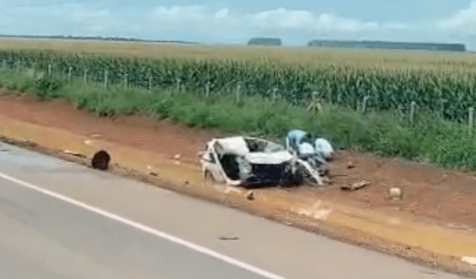 O caminhão Volvo, carregado com suínos, e o veículo VW Gol colidiram, hoje, no km 722 da BR-163, entre o distrito de Primaverinha e a área urbana de Sorriso.