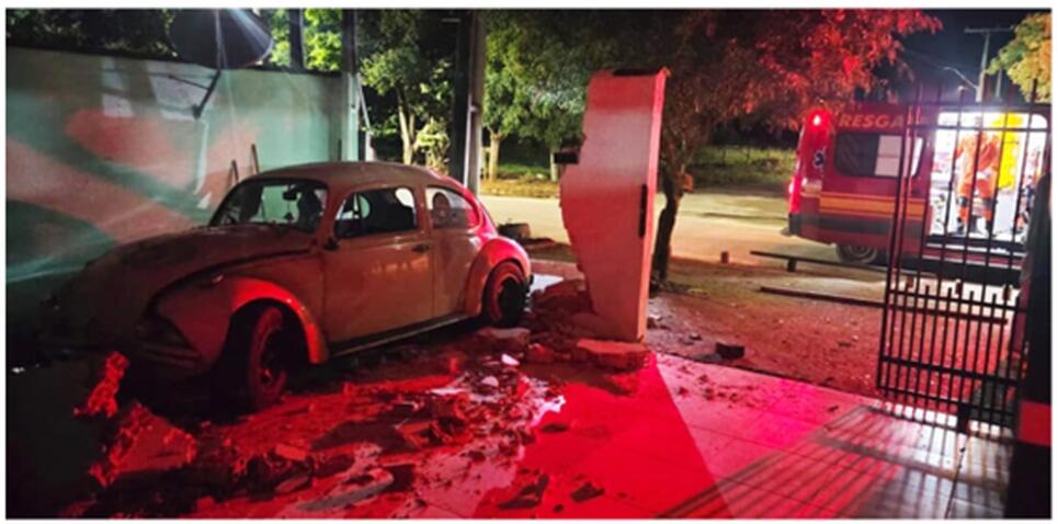 O acidente de trânsito com o VW Fusca 1600 branco ocorreu hoje de madrugada, na avenida Brasil, próximo ao bairro Jardim Primavera, em Alta Floresta.