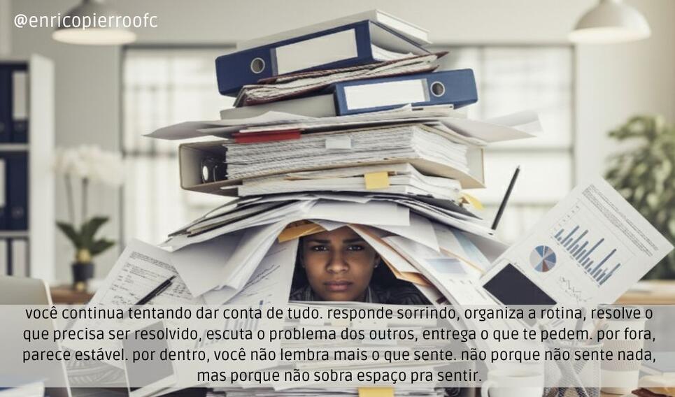O problema é que ninguém percebe. E nem vai perceber. Porque você se tornou funcional. Você aprendeu a esconder. A engolir o cansaço, a adiar o choro, a deixar para depois o que você mesmo precisa. E o mundo, que adora eficiência, aplaude. Quanto mais você se anula, mais dizem que você é forte, que você é maduro, que você dá conta. Mas a verdade é que dar conta não significa estar bem. Dar conta não significa estar inteiro. Dar conta, às vezes, é só o que resta quando a gente já desistiu de ser cuidado.