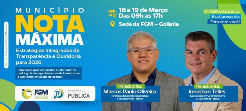 A Federação Goiana de Municípios (FGM) promove, nos dias 18 e 19 de março, na sede da entidade em Goiânia, o evento “Município Nota Máxima Estratégias Integradas de Transparência e Ouvidoria para 2026”, uma capacitação voltada a gestores e servidores municipais que desejam elevar o nível de transparência pública e melhorar o desempenho institucional nos indicadores nacionais.