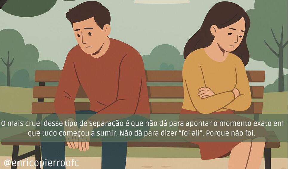 É difícil perceber esse tipo de fim, porque ele não vem com data, não vem com anúncio, não vem com drama. Vem com silêncio. Com a falta de vontade de dividir o dia. Com a preguiça de perguntar como o outro está. Com a sensação de estar sozinho, mesmo de mãos dadas. Você continua junto, mas já não está mais ali. E o outro também não.